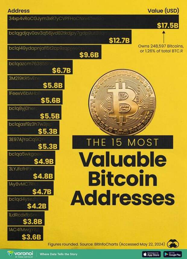 This graphic, via Visual Capitalist's Marcus Lu, ranks the 15 most valuable Bitcoin addresses globally as of May 2024, based on BitInfoCharts’ Bitcoin Rich List.