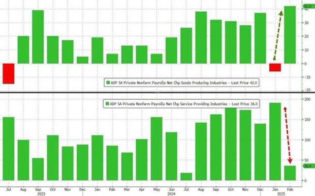 Perhaps more odd still is the fact that goods-producing firms saw a huge jump in job additions (Trump driving confidence in manufacturing with the biggest addition since Oct 2022) while Services was job additions tumble...