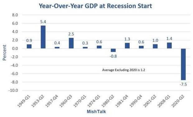 Excluding the Covid collapse, the average of 11 instances has year-over-year GDP at the start of recession at 1.2 percent.
