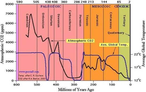 Let us consider some of these observations starting with the long term record over 600 million years. The graph below shows wide temperature-CO2 divergence.