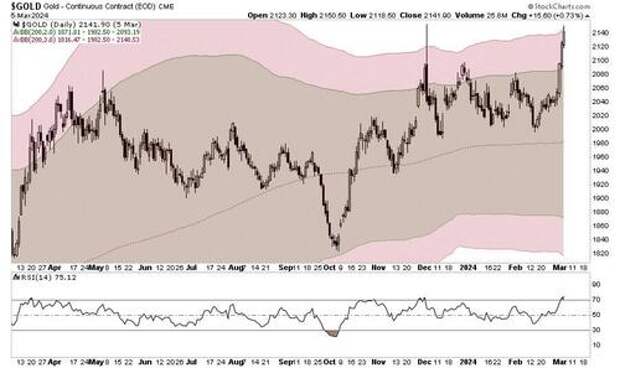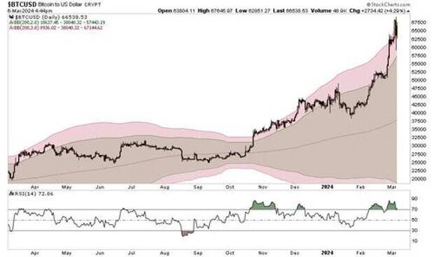 The same is seen with digital currencies. Given the recent approval of spot, Bitcoin exchange-traded funds (ETFs), the panic bid to buy Bitcoin has pushed the price well into 3 standard deviation territory with an RSI of 73.