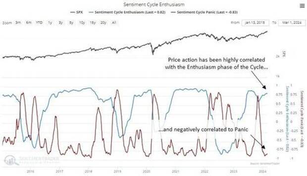 “Over the past 18 weeks, the straight-up rally has moved us to an interesting juncture in the Sentiment Cycle. For the past few weeks, the S&P 500 has demonstrated a high positive correlation to the ‘Enthusiasm’ part of the cycle and a highly negative correlation to the ‘Panic’ phase.”