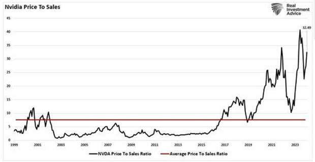 “Since then, the entire market has surged higher following last week’s earnings report from Nvidia (NVDA). The reason I say “this is nuts” is the assumption that all companies were going to grow earnings and revenue at Nvidia’s rate. There is little doubt about Nvidia’s earnings and revenue growth rates. However, to maintain that growth pace indefinitely, particularly at 32x price-to-sales, means others like AMD and Intel must lose market share.”