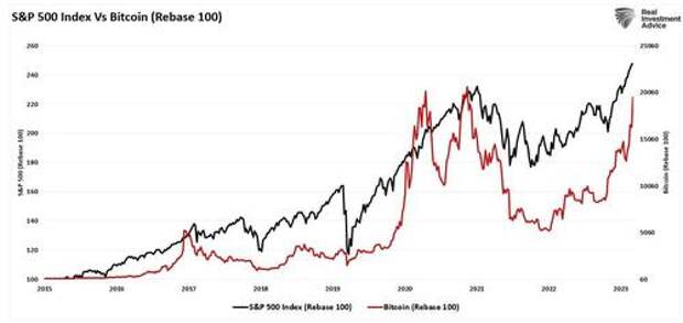 The same goes for cryptocurrencies. Bitcoin is substantially more volatile than gold and tends to ebb and flow with the overall market. As sentiment surges in the S&P 500, Bitcoin and other cryptocurrencies follow suit as speculative appetites increase. Unfortunately, for individuals once again piling into Bitcoin to chase rising prices, if, or when, the market corrects, the decline in cryptocurrencies will likely substantially outpace the decline in market-based equities. This is particularly the case as Wall Street can now short the spot-Bitcoin ETFs, creating additional selling pressure on Bitcoin.