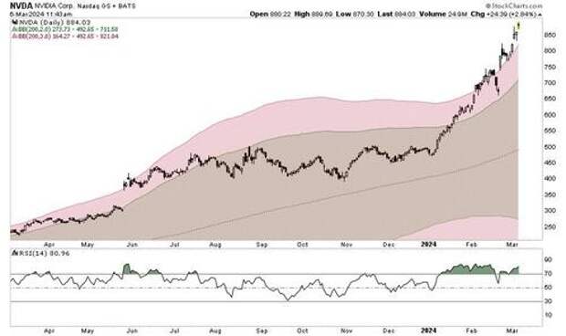 With those two measures, let’s look at Nvidia (NVDA), the poster child of speculative momentum trading in the markets. Nvidia trades more than 3 standard deviations above its moving average, and its RSI is 81. The last time this occurred was in July of 2023 when Nvidia consolidated and corrected prices through November.