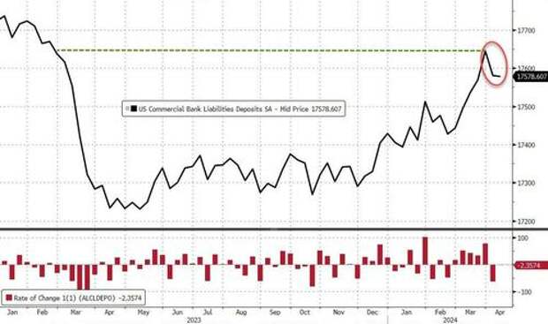 On a seasonally-adjusted basis, total US bank deposits declined for the second straight week (though only $2.4BN) after reaching back to pre-SVB levels...