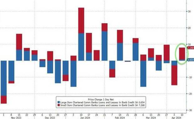 But, unlike last week when deposits dropped, we saw bank loan volumes rise (not fall) in the week ending 4/10 with large bank voilumes rising 0.65BN and small bank volumes rising $7.3BN...
