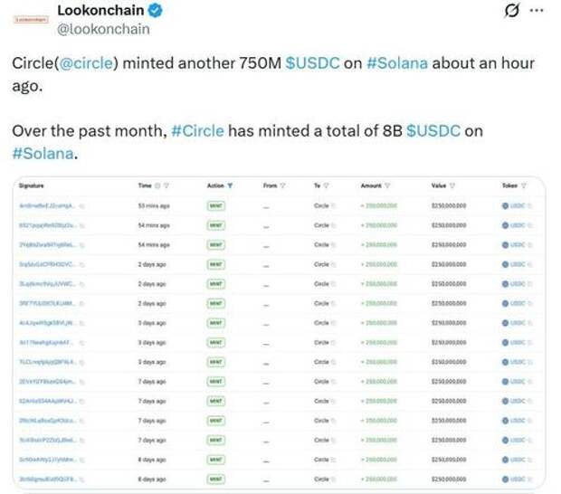 During the past month, Circle minted $8 billion worth of USDC on the Solana network alone, with $750 million minted on Thursday, according to blockchain data platform Lookonchain’s X post.