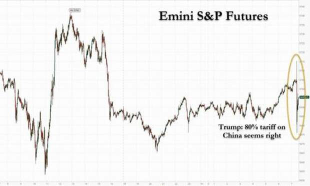 US equity futures traded modestly higher pointing to a third day of gains, until just before 730am ET when Trump decided to play bad cop to Scott Bessent's good cop and posted on Truth Social that "80% Tariff on China seems right!" but then added that the final tariff rate is "Up to Scott B. "