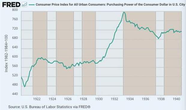 Why did they do this? Because the prevailing economic theory at the time preached that the reason for the decline in business activity was the deflation itself. Somehow they decided that the way to fix the problem was to make goods and services more expensive for consumers and businesses.