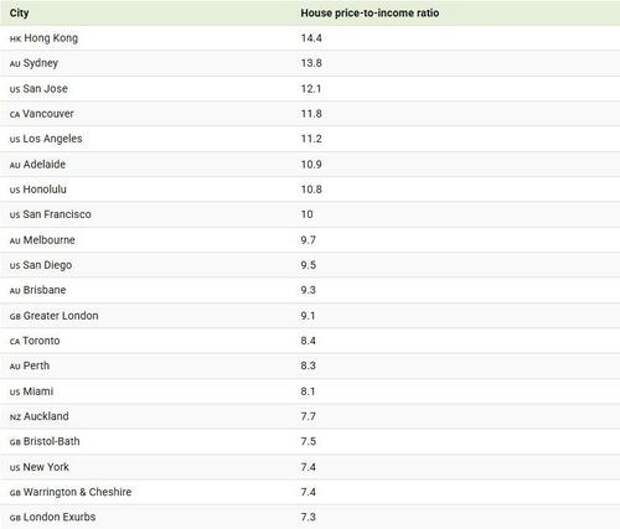 Hong Kong tops the global list with a staggering house price-to-income ratio of 14.4. This means the typical home costs more than 14 years worth of household income.