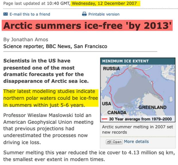 Heller referenced a 2007 BBC News article titled "Arctic summers ice-free 'by 2013'," which warned readers of the supposed threat that "latest modeling studies indicate northern polar waters could be ice-free in summers within just 5-6 years. "