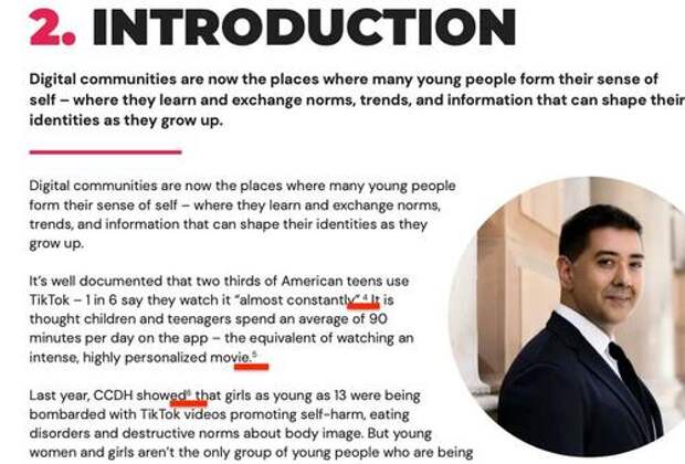 The first footnote in Ahmed’s introduction is a report by Pew Research Center (4), an organization known for putting out serious studies. But the next three citations are an article at the website TechCrunch (5), one of CCDH’s own reports (6), and a Washington Post news story (7).