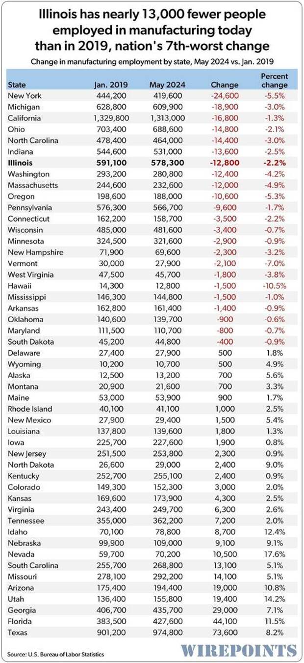 Illinois manufacturing employment is down as well. Since January 2019, Illinois manufacturing employment is down 12,800, the nation’s 7th-worst performance, according to the BLS’ Current Employment Statistics Program.
