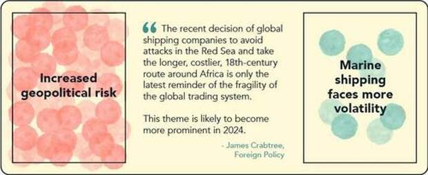 One such example is how escalating conflicts in the Middle East are affecting shipping insurance costs and routes, which could drive up inflation again and lead central banks to hold off on cutting interest rates this year, thus affecting myriad economic factors and markets around the world.