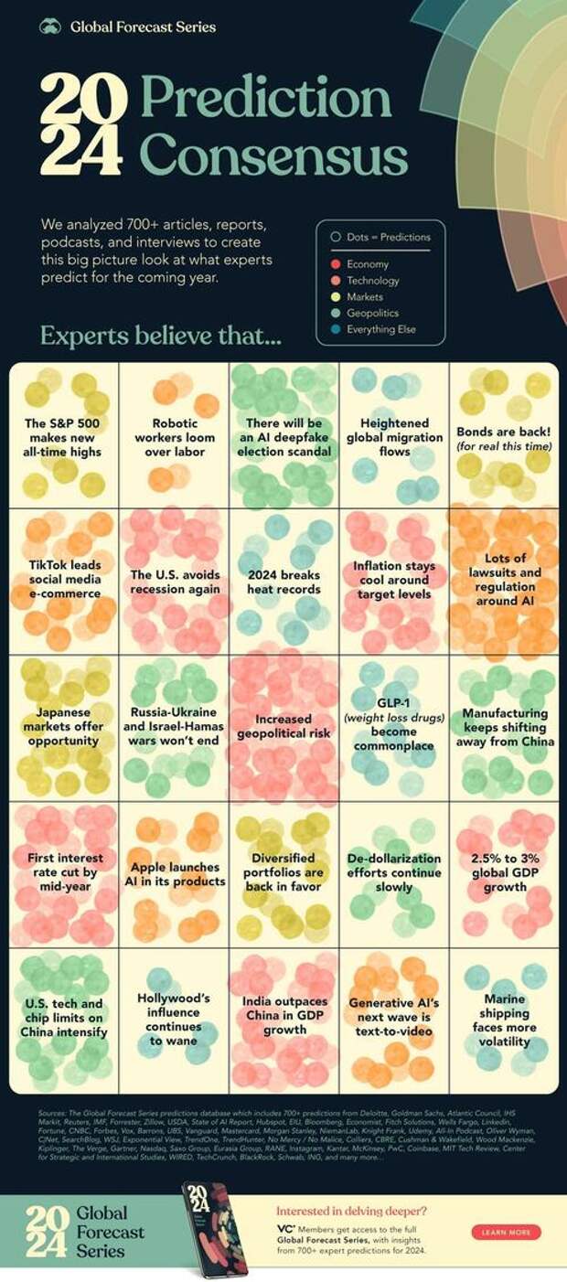 In this now fifth year of our Prediction Consensus (part of our comprehensive 2024 Global Forecast Series), we’ve summarized 25 of the most common predictions and forecasts by experts into a single visual of what’s expected to happen in 2024.
