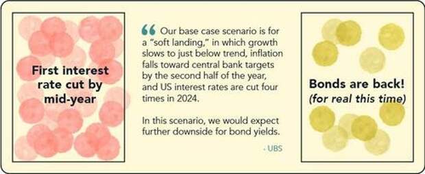Forecasts from analysts on how much rates will be cut vary between three and six cuts, with Federal Reserve board members themselves forecasting two to three cuts.Markets: With interest rate cuts on the horizon, experts have echoed tentatively positive forecasts for both stocks and bonds in 2024. Falling rates should see bond yields fall as well, while equities should continue to benefit from the growing AI theme. Portfolio diversification is a common theme in the 2024 investment playbook, especially as geopolitical risks loom.