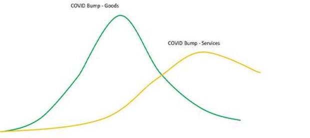 Goods had a much larger jump in inflation, and it started sooner as Americans were flush with cash and had immense built-up demand for goods, especially for those who were experiencing lifestyle changes enabled by work from home. The Manheim Used Vehicle index is a good one to watch on this.