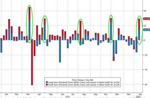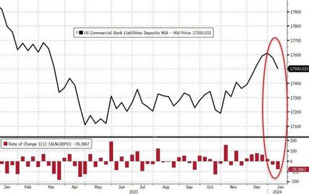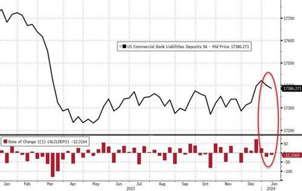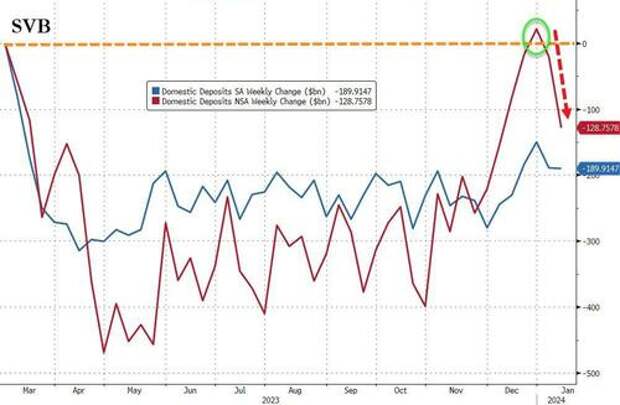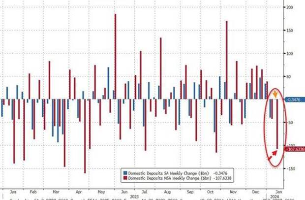 On a non-seasonally-adjusted basis, banks have seen deposit outflows of $111BN in the first two weeks of 2024...