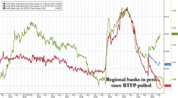 Because without the help of The Fed's BTFP, the regional banking crisis is back bigly (red line), and large bank cash needs a home - green line - like picking up a small bank from the FDIC...