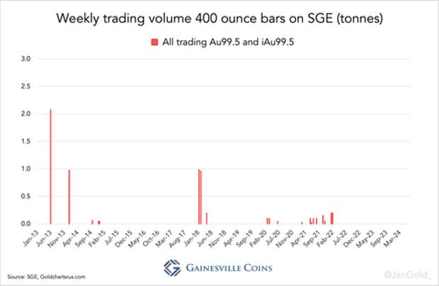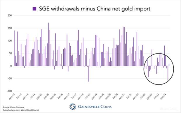 Readers with deep knowledge of the Chinese gold market might think: “what if the large bars are refined in FTZs and loaded into SGE vaults without being withdrawn?” I checked with a source that has connections to refineries in China, and according to this person the refineries don’t use any large bars as feedstock for producing 1kg bars for the SGE*. Another contact I have, close to the SGE, shared with me that SGE inventory in April 2024 accounted for about 300 tonnes. Inventory had gone up recently together with a rise in the price of gold, this person said. However, the increase in SGE inventory can’t make up for the surplus in the market, which is at least 400 tonnes according to my calculations.