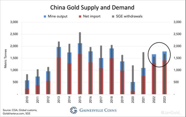 Indeed, both in 2022 and 2023 China’s net import plus mine output transcended SGE withdrawals (let alone if we would add recycled gold).