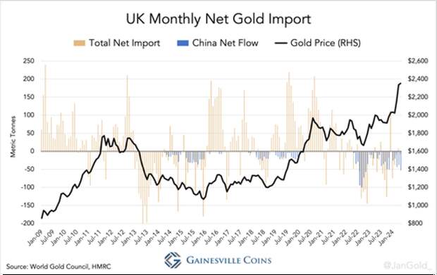 “Unreported” PBoC gold purchases exploded when $300 billion in foreign exchange reserves from the Russian central bank were frozen by the West early 2022 due to the war. Notably, the UK began exporting 400-ounce bars to China in huge tonnages at the same time. Coincidence? I think not. Ever since, China has taken over gold price control from the West and broke the gold price’s correlation with “real rates” (10-year TIPS yield).