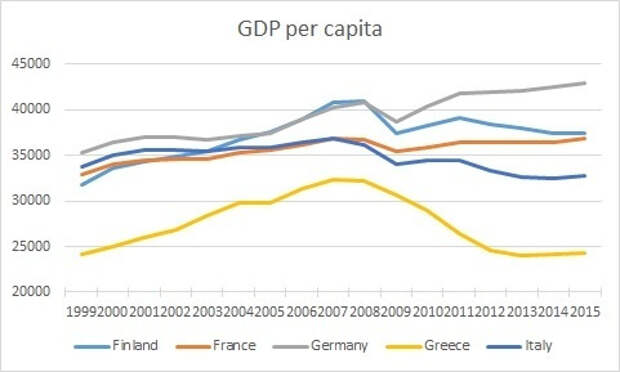 The problem of the euro can be visualized in the development of the GDP per capita.