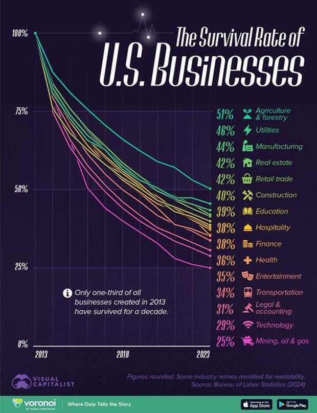This chart, via Visual Capitalist's Pallavi Rao, tracks the survival rate of all private American companies born in 2013, categorized by industry.