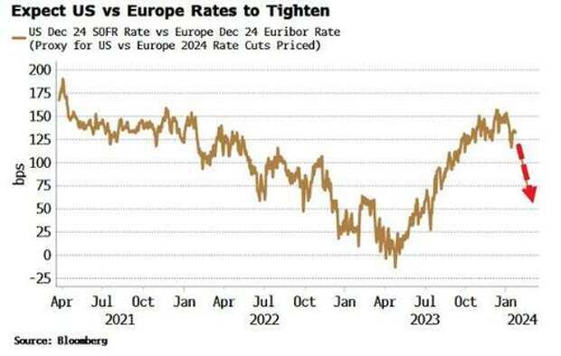 It’s likely the spread between rate cuts priced in for the Fed and the ECB for this year will narrow, i.e. the December 2024 Euribor contract will underperform the December 2024 SOFR contract (or using December Euribor and September SOFR so that contracts expire on same day).