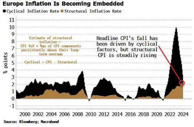 Europe’s disinflation has been driven by cyclical factors, e.g. oil and energy prices, but structural inflation has been rising, as can be seen in the chart below.