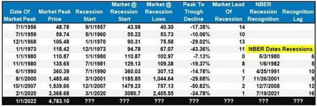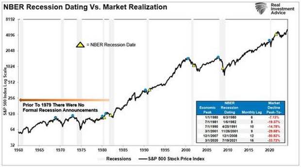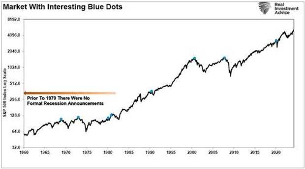 With that understanding,let’ss return to those”“interesting blue dot”” in the S&P 500 chart above. Each dot represents the market peak before the onset of a recession. The S&P 500 peaked and turned lower in nine of ten instances before a recession was recognized, anywhere from 6 to 16 months later.