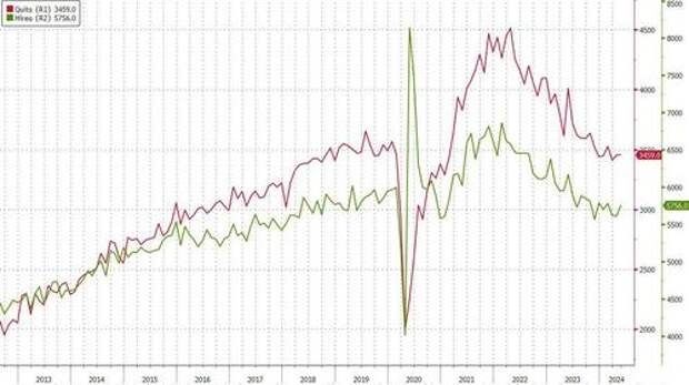 Linked to this, we find that amid the stagnant level of quits, the number of hires actually rose by 141K to 5.746 million, the highest since February.