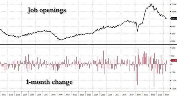 After two months of sharp declines in the number of job openings, moments ago Biden's highly politicized Department of Labor reported that in May, the number of job openings unexpectedly spiked by a whopping 221K, to 8.140 million - far above the 7.