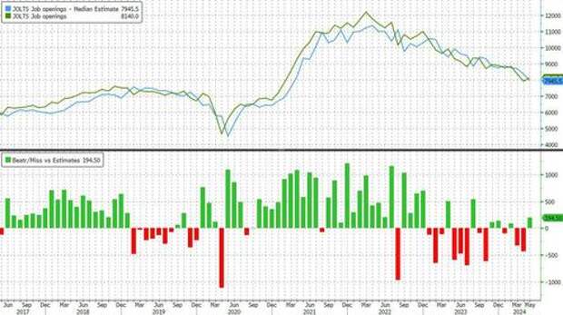 950 million estimate - from a downward revised April print of 7.919 million, down 140K from the original print of 8.059 million.The 194K beat of estimates was the biggest since last August...