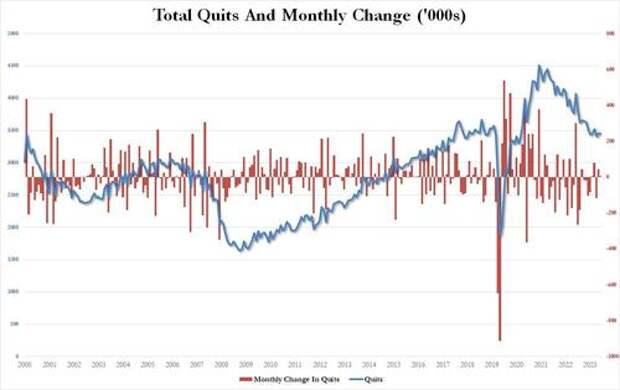A quick look at the number of quits, an indicator closely associated with labor market strength as it shows workers are confident they can find a better wage elsewhere, shows that after March's unexpected plunge by 118K (revised from a collapse 198K), in April and May we saw modest increases here, with the number of quits rising by 43K and 7K, respectively, but still holding at multi-year lows.