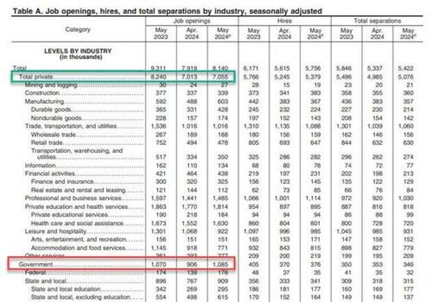 To summarize: government job openings, which contribute nothing to the economy and are just a form of wealth redistribution, are soaring while private sector job openings are crashing.