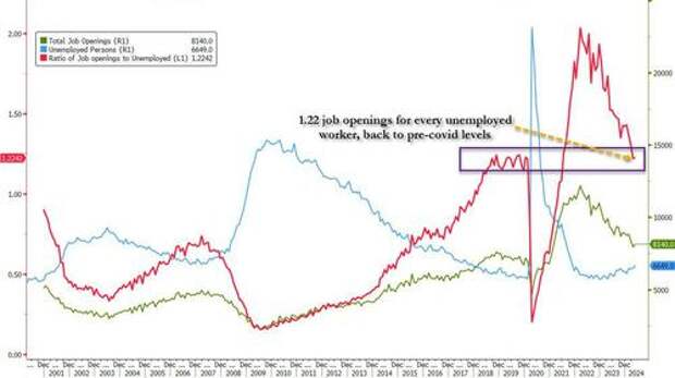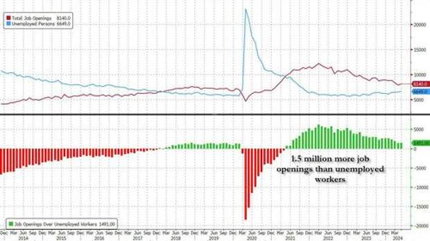 Ignoring the data manipulation, in the context of the broader jobs report, in May the number of job openings was 1.5 million more than the number of unemployed workers (which the BLS reported was 6.649 million), up modestly from last month's 1.427 million but otherwise the second lowest since the summer of 2021.