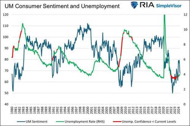 Before the recent experience, the average unemployment rate when the Michigan sentiment reading was at or below current levels was nearly 8%. Today, it is roughly half of that figure, yet sentiment is lousy.