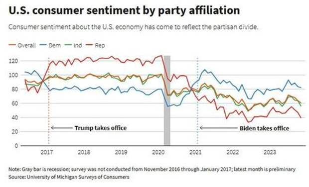 Political views can sway confidence, especially during mid-term and Presidential elections. For instance, the graph below, courtesy of Reuters, shows the distinct changes in economic confidence as the political party of the President changes.