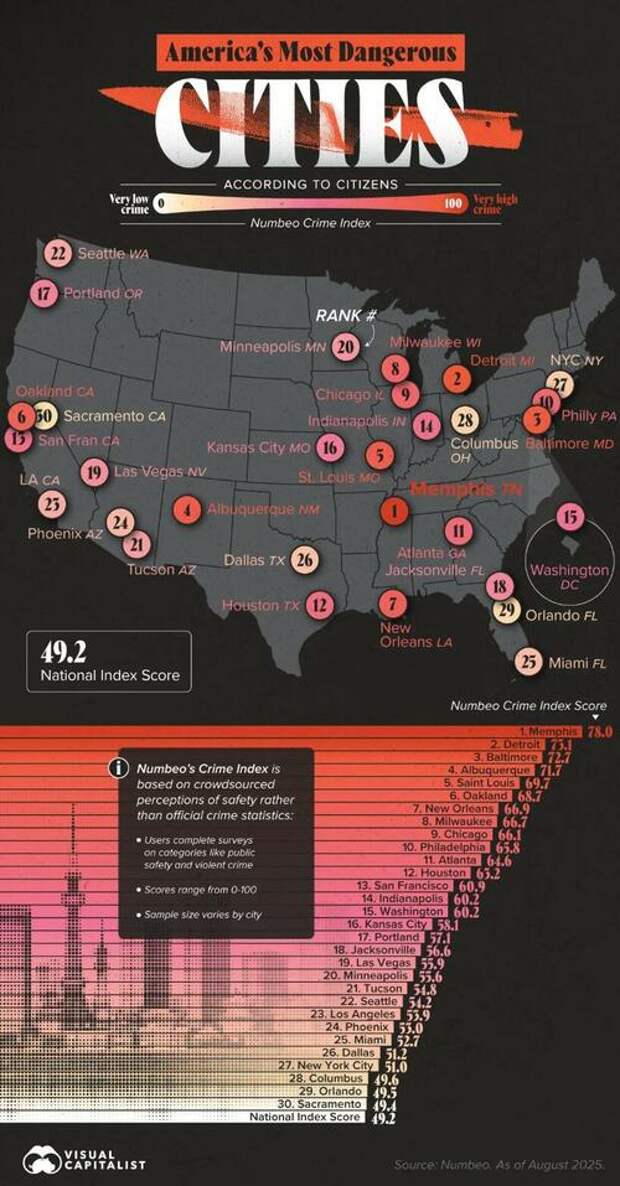 At the top of the list, Memphis, Tennessee registers the highest crime index score at 78, marking it as the city Americans perceive as the most unsafe in 2025.
