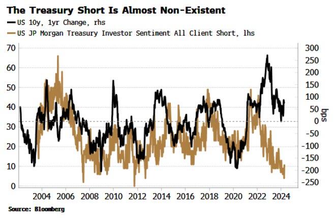 JP Morgan’s Treasury Survey tracks their clients’ positioning in Treasuries, asking them whether they are long, neutral or short.