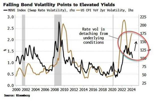 The gap is likely to be closed by rising bond volatility, and given the inflation backdrop, yields are poised to remain elevated.