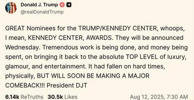 “I was honored by it,” Trump told reporters after the news broke. “The board is a very distinguished board, most distinguished people in the country, and I was surprised by it. I was honored by it.” Despite his expression of surprise, Trump himself has previously engaged in his own half-joking rebranding of the venue: