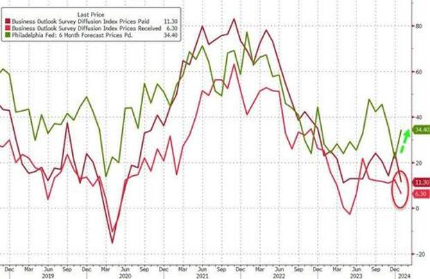 On the bright side for the doves, the dis-inflationary trend remains in tact as priced paid and prices received both plunged in January. However, we highlight the fact that Philly businesses expect price pressure to return in the next six months...