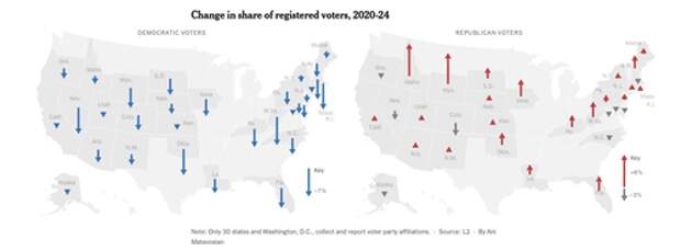 Voter registration data from 2020-24 shows broad-based erosion across all 30 states that track party affiliation. Democrats lost a net 4.5 million voters, in what the NYT calls a "deep political hole that could take years to climb out of."