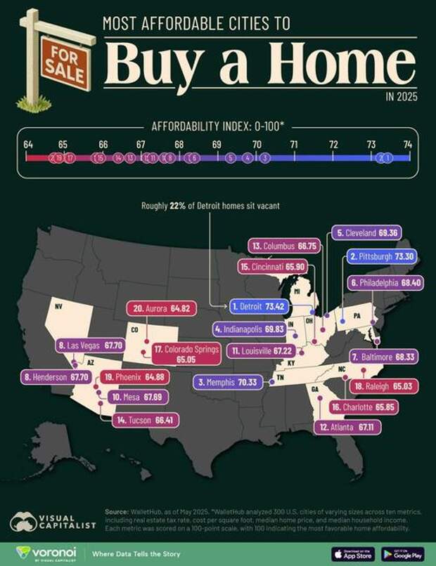 For this map, only cities with a population over 100,000 were considered.This map, via Visual Capitalist's Bruno Venditti, shows the 20 most affordable U.S. cities to buy a home in 2025, according to data from WalletHub.