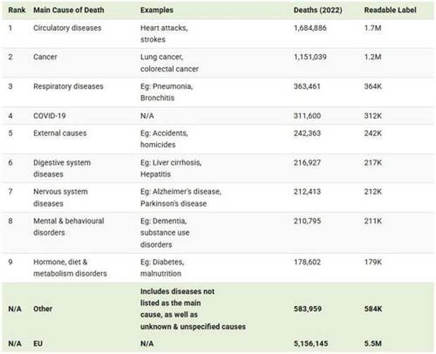 Respiratory diseases took 363,000 lives, but that figure excludes the 312,000 officially attributed to COVID-19 in 2022.