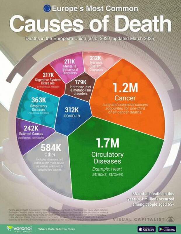 The infographic, via Visual Capitalist's Pallavi Rao, breaks down top causes of death that year, revealing the persistent dominance of heart-related illnesses and the continued threat from cancer.