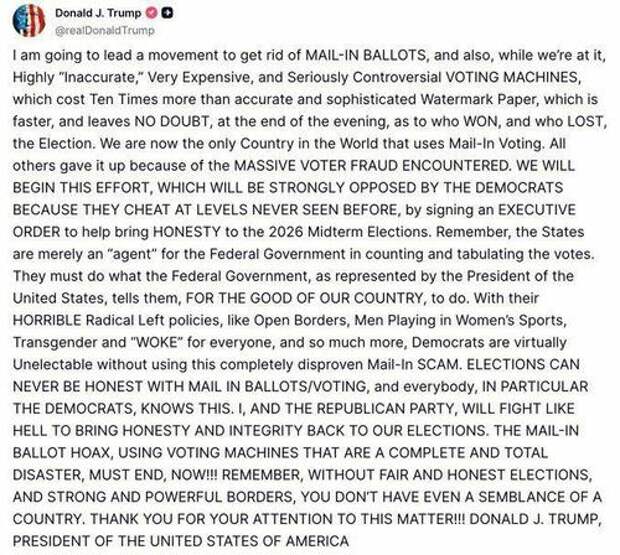 "We're going to END mail in voting. It's a FRAUD! It's time the Republicans get tough and STOP IT!"
